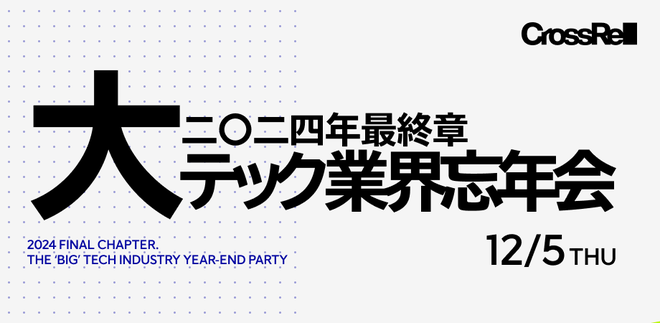 CrossRel2024年最後、最速の大型忘年会(当社調べ)です。エンジニア、デザイナー、PM…すべての開発職が集うイベントになります! 1年の出来事を振り返りながら、楽しく1年を締めくくりましょう!